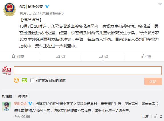 10月8日22时47分,深圳市公安局龙华分局官微对此进行了情况通报。10月7日20时许,分局油松派出所接报辖区内一商场发生打架警情。接报后,民警迅速赶赴现场处置。经查,该警情系因两名儿童玩游戏发生矛盾,导致双方家长发生纠纷进而引发肢体冲突,并致一名当事人轻伤。目前涉案人员均已在警方控制中,案件正在进一步调查中。