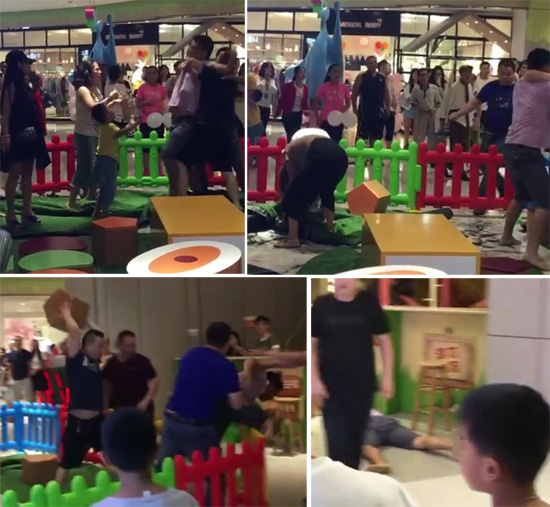 网传视频显示,在一所商场内的儿童游乐区内,有若干名男子、两名女子在激烈打斗。另有家长慌忙将孩子带离区外,还有工作人员和顾客在惊愕围观、劝架。其中一名身穿粉色上衣男子被一名黑衣男子高举的立方体积木砸倒,俯卧在地,不再动弹。在微博和微信群内,有人称打架地点为深圳龙华星河ICO,事情是“两个孩子抢玩具,引妈妈对骂、对打,然后各自老公打,然后老公朋友打,结果是某个老公被打成植物人”,引发网民关注。一些评论惋惜称“两个家庭算废了”,“冲动是魔鬼”。