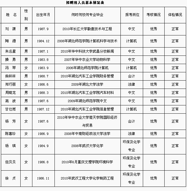 按照县政府的安排,依据《湖北省事业单位公开招聘工作人员暂行办法》的规定,本着公开、平等、竞争、择优的原则,经笔试、面试、考核、体检等程序,拟聘用刘潇等十五名同志分别为县行政服务中心、县民政局、县人力资源和社会保障局、县环境保护局等所属事业单位工作人员,现予以公示。对公示人员有异议的,请在公示期内,直接与县人力资源和社会保障局或县纪委监察局联系。<?xml:namespace prefix = o ns = "urn:schemas-microsoft-com:office:office" />