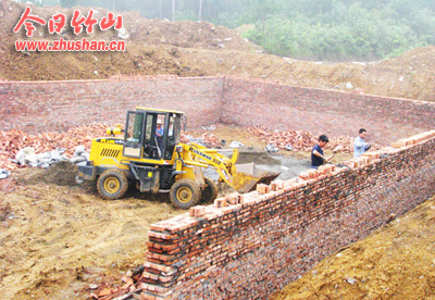 今日竹山网消息 7月21日,笔者在秦古镇西庄村人畜饮水工程现场看到:大型机器正在加紧施工,工人顶着烈日建设蓄水池。该工程于3月份启动,总投资18万元,蓄水池容水量约为1600方,可以解决130多户800多人和牲畜饮水、300多亩农田灌溉难问题。