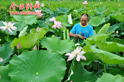 今年3月,袁涛从武汉引进栽植了鄂莲和紫莲藕种,实施泥鳅、黄鳝混养。为引导村民规模发展莲藕,他联合22户莲藕种植大户成立了汇诚水生蔬菜专业合作社。目前他的150莲藕长势喜人,实验大田的莲叶平均高度达1.7米以上。据测算亩产可突破3000公斤。谈起规模发展莲藕,他兴奋地说:“以汇诚水生蔬菜专业合作社为依托,用两年时间将莲藕面积发展到300亩,力争常年为本县提供50-100万斤鲜藕;做好莲藕深加工,引进先进的生产工艺,生产优质莲子和藕粉;用五年时间,打造集旅游、休闲、观赏于一体的具有水乡特色的农家乐品牌,带动百余户村民种莲藕致富。”(党世根 石濡华 摄)