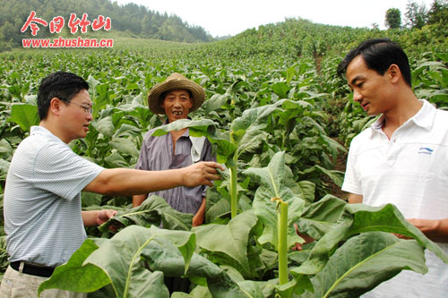 今日竹山网消息 7月28日,大庙乡党委书记、乡长陈松和党委副书记、人大主席操亚来到鲁家坝村烤烟基地,督促检查烟农做好烟叶管理。当前,正是烟叶田间管理、病虫害防治和烘烤的关键时期,稍有松懈就会全功尽弃。该乡采取干部包户,技术员包地块的办法,强化服务,确保今年烤烟产值达到300万元。(袁平凡 章海波 摄)