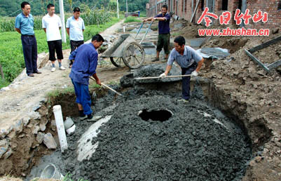 今日竹山网消息 8月4日,宝丰镇喻架塔村龙背湾水电站移民集中安置点正在抢时间建沼气池。宝丰镇安置龙背湾移民103户,为让移民用上新能源,该镇统一规划、统一标准、统一施工,为每户移民建上沼气池,移民搬家后直接使用。据悉,该镇今年已新建沼气总数达到400口。(袁平凡 熊雷 摄)