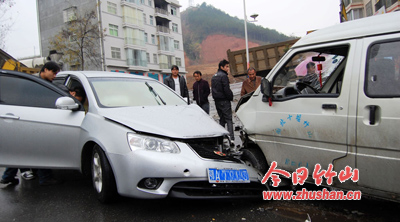 今日竹山网消息 11月14日上午,溢水集镇附近一弯道处发生一起交通事故,造成轿车和面的车严重受损(如图),好在司机和乘车人员均无大碍。事故发生后,交警人员迅速赶赴现场,展开施救和现场勘察工作。