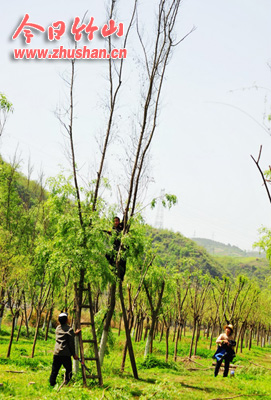 今日竹山网消息 4月10日,七八名工人在县城堵河防洪堤堵河青年林(柳树林)里对柳树进行“理发”,除去已枯死的柳树梢或死亡的整棵柳树。