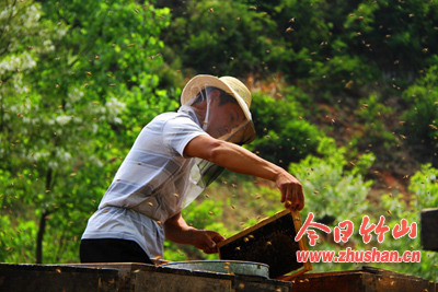 今日竹山网消息 4月24日,来自房县红塔乡的养蜂人李永兵正在擂鼓镇金岭村公路边的养蜂基地采集蜂蜜。李永兵18岁开始养蜂,有着20多年养蜂经历。婚后,夫妻俩逐花而居,四处迁徙,白天忙着搬运蜂箱、起蜂巢、打蜂蜜,晚上守着一笼笼蜂箱和简易的生活用品单调而枯燥地生活着,年收入三四万元。(操儒舜 蒋宁)