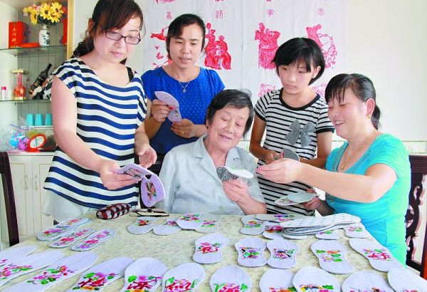秦楚网讯(十堰日报) 7月27日,竹山县麻家渡镇柿树坪村省级第二批非物质文化遗产“传统美术类剪纸传承人”喻少贞(前中)在评点当地农家女绣出的手工鞋垫。近年来,该县计生局、计生协等单位采取多项措施,鼓励农家女学习“十字绣”、“剪纸”等传统民间手艺,既丰富了农家女文化生活,又培植了一批农村巾帼文化新人。(特约记者朱本双 通讯员朱名绍 摄)