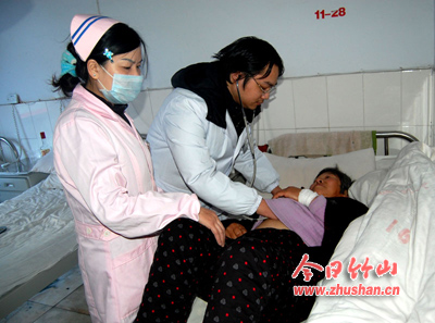 今日竹山网消息 城关镇卫生院针对农村新型合作医疗制度实施以来,农村患者前来就医较多的现象,为了让患者得到快捷、周到的医疗服务,今年该院对科室推行优质服务月考核制度,在些倡导下,各科室都主动开展精细服务,医生和护士都对就医病人精心诊疗和护理,为其提供便利,受到患者赞誉。图为该院内科医生和护士在为住院病人认真检查的情景。 (苗东升)