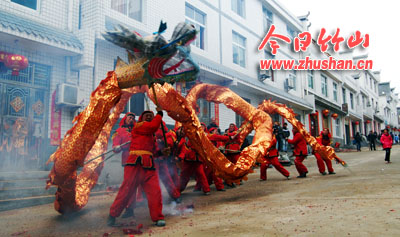 为让全镇人民过上一个安乐、祥和、充满文化气息的春节,该镇精心筹备四大四小八只狮子、两条祥龙、40人的腰鼓队,大年三十下午首先来到上庸镇政府大院,随后又到集镇移民家家户户开展文艺拜年活动。(林红)