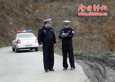 今日竹山网消息 3月28日,县交警一中队队长张青山(左)在潘口乡甄别乡村公路危险路段的情景。为落实全县安全生产工作会议精神,潘口乡会同县交警一中队,对潘口乡辖区内的通村水泥路的险路、险段进行甄别,在危险路段设置警示标志、标牌,确保通村水泥路的安全畅通。(李修平 刘衍奎)