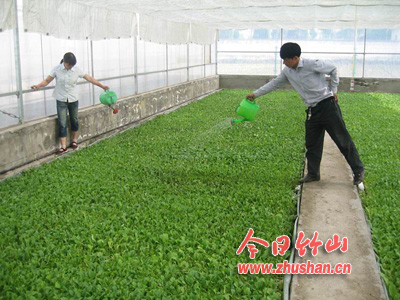技术人员从河里挑水来在育苗