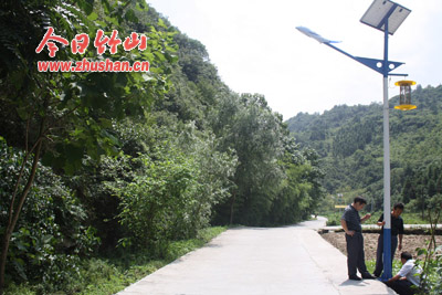今日竹山网消息 7月24日,楼台乡三台村观音沟施工现场技术人员正在忙着安装调试太阳能环保路灯,并投入使用。三台村观音沟是我县新建生态文化旅游区。为了节约能源,打造低碳环保经济,优化旅游区环境,该村多方筹资42万元,对3公里长的主干道安装了60盏集照明杀虫于一体的太阳能环保路灯。(陈昌荣 龙德恒)