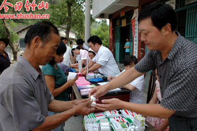 今日竹山网消息 7月26日,大庙乡卫生院组织医护人员深入该乡鲁家坝村开展送医、送药、送政策下乡活动。当日免费为村民发放了价值1200元的药品,为100多名群众进行了健康检查,发放各类健康知识宣传单和手册1500份。图为大庙乡卫生院院长朱旭江为村民免费发放药品的情景。(袁平凡 章海波 摄)