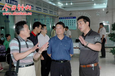 今日竹山网消息 7月26日,市行风评议督导检查组来县农商行检查指导行评工作,董事长刘玉山代表县农商行做了行评工作开展情况汇报,市行评督导组对县农商行转变工作作风,扎实开展支农工作,为地方经济建设提供良好的金融服务给予了高度评价,要求再接再励把下阶段行评整改工作落实得更好。图为督导组查看营业办贷大厅。(胡奎 摄)