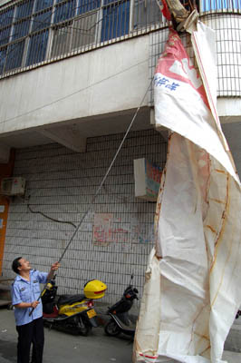 今日竹山网消息 8月18日,县城建执法大队在拆除破损广告招牌。8月初以来,该大队重手整治城区市容市貌,已拆除破旧广告招牌20余块,规范设置门店头小招牌6户,清理商业性条幅50余条。(党世根 陈诚)