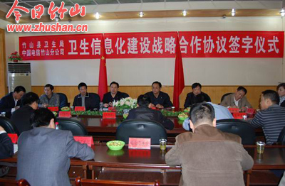 今日竹山网消息 9月21日,县卫生局局长张德福与中国电信竹山分公司总经理徐文全就建立适应新医改要求的卫生信息化建设签订了合作协议。到年底,全县150个村可达有线网,88个村覆盖无线网。