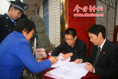 今日竹山网消息 近年来,县法院以老年人、残疾人等弱势群体为重点,为其提供便捷、高效的司法服务。图为10月9日,该院得胜法庭集中为一批因交通事故致残当事人兑现执行款30万元。(明梦秋)