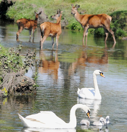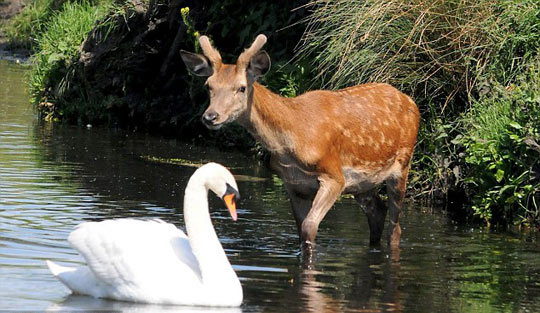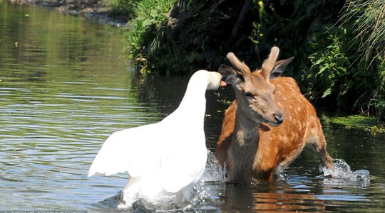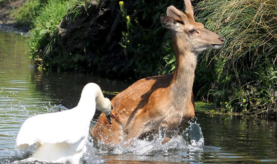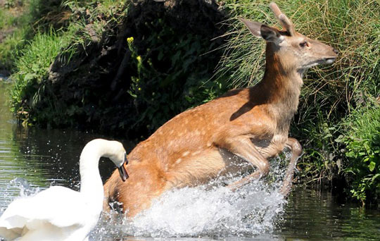 据英国媒体报道,英国30日的气温升至26度,不仅人们出去晒太阳,就连动物们也想去水里凉快下。一只年幼的小鹿在伦敦的Richmond公园里想小浸鹿蹄,不幸地是,该地盘内的主人天鹅却并不想和小鹿分享这一湖水,立刻对准小鹿的耳朵猛啄,用力捍卫自己的领土。尽管小鹿在体形上占据优势,但是小鹿最终还是不敌凶悍的天鹅,落荒而逃。