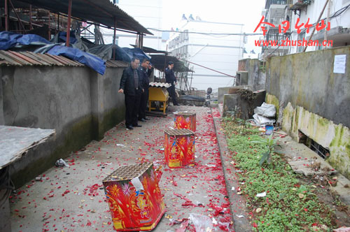 在龙背小区内的一栋居民楼前,记者看到,3个刚刚燃放完毕的烟花筒摆放在狭窄的过道上,半空中烟雾缭绕,路上纸屑满地。一名刘姓老奶奶告诉记者,自己身体不好,起得晚,今天就是被烟花声惊醒的,“幸好警察来的早,不然不知道他们还会不会继续放烟花!”刘奶奶欣慰地说。