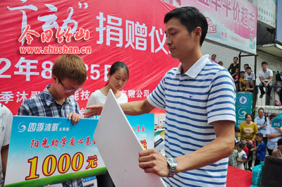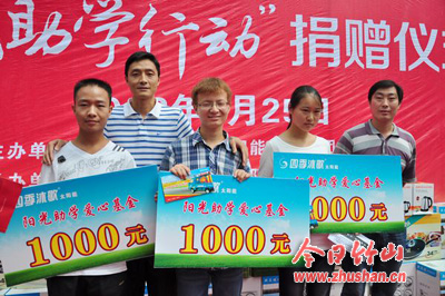 今日竹山网消息 8月25日,我县四季沐歌太阳能代理商在宝丰镇隆重举行“阳光助学行动” 捐赠仪式。竹山四季沐歌太阳能代理商齐永林总经理向3名毕业于竹山一中的贫困优秀学生分别发放助学金1000元,并勉励他们树立远大理想,勤奋学习,不负重望,早日成为社会有用之才。竹山一中团委对长期以来关心公益事业、支持帮困助学工作的四季沐歌太阳能公司表示了感谢,受助学生代表进行了发言。(李永芳)