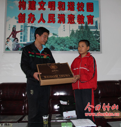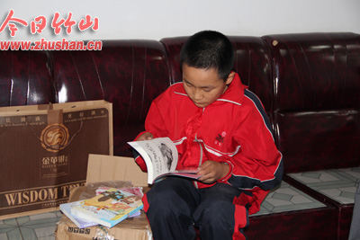 吕猛是上庸镇峪口小学五年级学生,在他出生的一个月后,母亲因病去世,父亲外出打工至今了无音讯,生活全靠年迈的奶奶照看。两年前,远在江苏的竹根联盟盟友快乐多多得知这一情况后,立即决定资助他,每学期资助他生活费600元,从未间断;这次委托竹根联盟盟友到学校看望吕猛,并为他带来600元爱心款,得知吕猛即将过生日,又寄来了6本崭新的少儿读物和中秋礼物(一盒精品盒装月饼),使吕猛过上快乐的生日和中秋节。