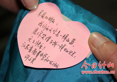 更让人感动的是,这些衣物中有不少小纸条,是南菁中学初一(6)班的学生写的。一个叫李莹的孩子用诗一般的语句写道:“你我之间,没有什么界限,只有同一片蓝天;你我之间,没有什么不同,只有那辽阔天空,凭什么我们不能做朋友?世界那么大,何处不是家?何况,我们给予你的温暖,也使我们自己,春暖花开。”文峰乡小学生林泉收到衣物后,也写了一张纸条说:“谢谢大哥哥给我送来了温暖,我很感动,我长大了也会给别人传递温暖的。”(陈剑 许海涛 刘艳)