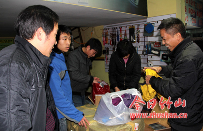 在旺江车饰(右一)的店里为竹山一中的特困学生发放衣服
