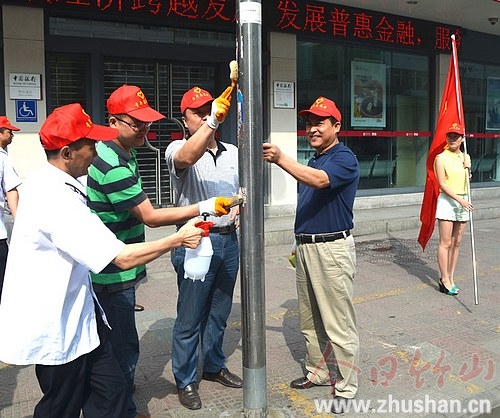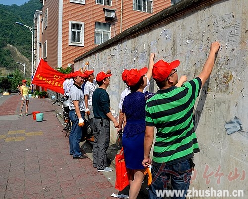 今日竹山网消息 6月18日,来自县城建执法大队、县卫计局、县环保局等部门的30多名五城联创志愿者带着扫把、铁铲、水桶、油漆等工具,走向城区街头,清除城市“牛皮藓”,为美化城市添彩。