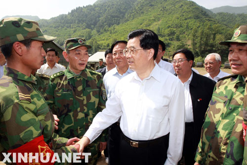 新华社记者 孙承斌 李清华 四川汶川大地震,给邻近的甘肃省部分地区造成很大灾害。中共中央总书记、国家主席、中央军委主席胡锦涛对此十分关注。在陕西地震灾区考察结束后,胡锦涛紧接着又来到灾情严重的甘肃省陇南市,看望慰问灾区干部群众和救援部队官兵,就进一步做好抗震救灾和恢复重建工作提出指导意见。 6月1日,胡锦涛在甘肃省委书记陆浩和省长徐守盛等陪同下,翻山越岭,一路颠簸,深入到陇南市康县和武都区的重灾乡村考察,同灾区干部群众共商灾后恢复重建大计。 地处深山的康县王坝乡李家庄村,共有252户人家,这次地震中有 152户房屋倒塌、100户房屋损坏。残垣断壁间,村民们正在部队官兵帮助下清理垮塌的房屋,为重建家园做准备。胡锦涛一户一户地仔细察看,并关切地向村民们询问:家里房屋倒了没有?有没有人受伤?现在吃的喝的有没有保障?……一位妇女告诉总书记,家里4间房全倒了,人都没受伤,现在吃的喝的都没问题,政府还发了补贴。她激动地对总书记说:“党和政府的帮助让我们看到了希望,我一辈子都不会忘记。”