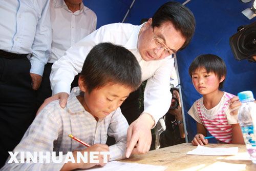6月1日,中共中央总书记、国家主席、中央军委主席胡锦涛在甘肃考察抗震救灾和恢复重建工作。这是胡锦涛在陇南市武都区马街镇姜家山村的一个帐篷里看望正在学习的孩子们。 新华社记者鞠鹏摄