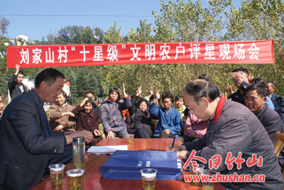 今日竹山网消息 11月7日上午,城关镇二道坊村委会门前,人群涌动,气氛热烈。这里正在召开“十星级文明农户”评选大会。