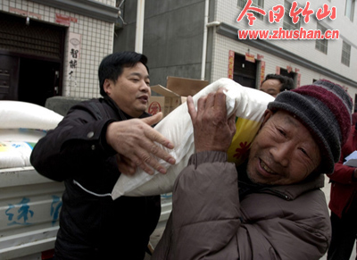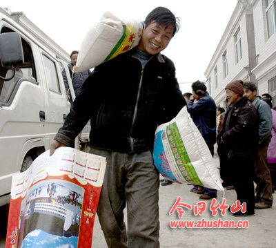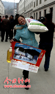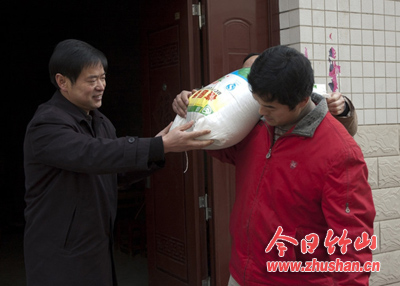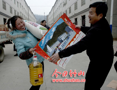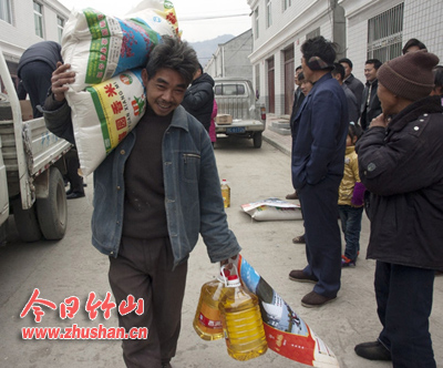 今日竹山网消息 1月13日,溢水镇朱家湾村移民安置点移民王兴友高兴地领到县移民局工作队送去的慰问品。