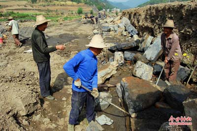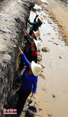 工人抢抓时间砌拦河岸,确保农田不受损失。