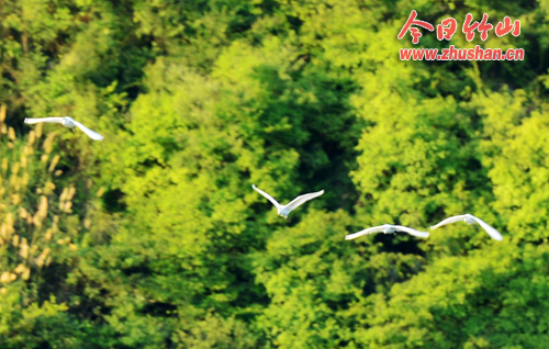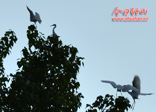 今日竹山网消息 8月中旬,记者在潘口电站库区上庸镇六里坪发现200只左右的白鹭群。这些白鹭栖息在临近水边的树上,早出晚归。据“上庸号”游艇驾驶员杨勤兵介绍,在上庸镇两河村及官渡镇三吉村还有较小的白鹭群。(陈剑 梁绍智)