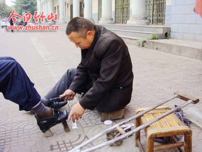 在城关镇人民路神龙宾馆大门右侧,不论天晴落雨,人们都能见到一位只有一条右腿的残疾人,他坐在冰冷的水泥地上,认真地为来往的市民擦着皮鞋。