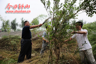 今日竹山网消息 连日大雨,使得堵河涨水,冲弯了河边数百柳树腰。8月11日,县林业部门十多名工作人员拿着镰刀,铁铲来到堵河边扶起“弯腰”柳树。工作人员肖本明告诉记者:“我们先将柳树扶正,再用镰刀砍掉它底部枝叶,减少阻力,以免下次在被水冲倒。”(全正 操春林)