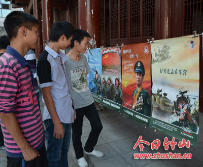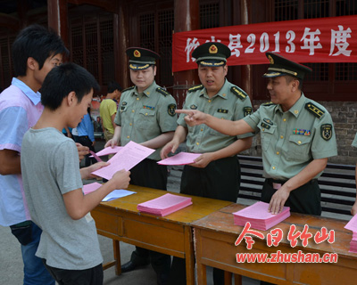今日竹山网消息 今年我县夏秋征兵工作启动后,县人武部组织征兵政策宣传组先后深入县一中、县职业技术教集团学校、县二中及乡镇宣传今年征兵工作政策,发放宣传资料,解答学生及青年疑问,教育和引导广大学生及青年报名应征。图为6月28日,县人武部宣传组在县职业技术集团学校设立咨询台,宣传征兵政策的情景。(苗东升 毛达清)