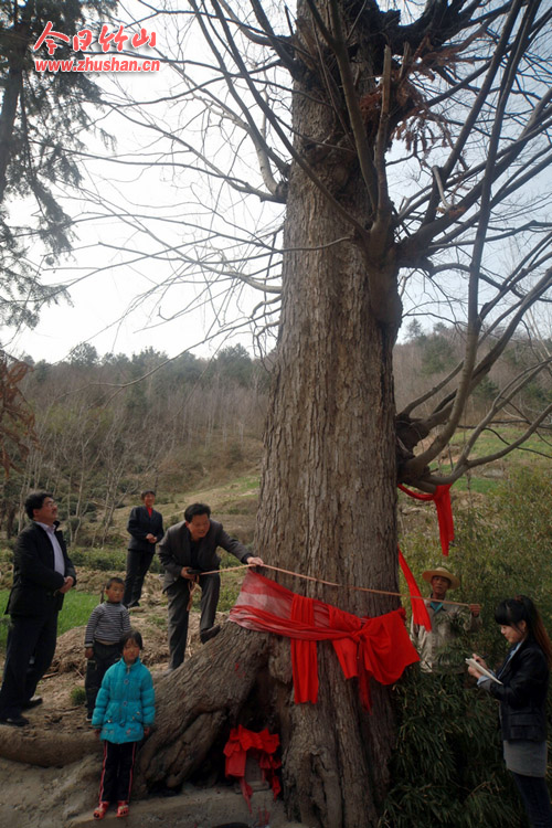 今日竹山网消息 3月27日,林业技木人员在双台乡界岭村为一株800年的榔树进行测量调查。我县地处鄂西北边陲,林木资源十分丰富,古树名木繁多,为全面掌握了解古树名木生存现状,县林业部门抽调专业技术人员,对登记在档的古树名木生存现状进行核查,为下一步制定保护方案和管护经费提供第一手资料。(操春林 蔡远笈)