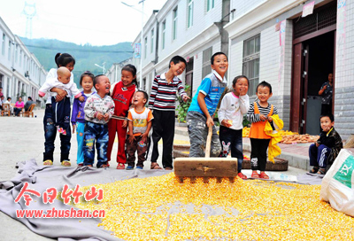 今日竹山网消息 9月24日,潘口水电站溢水镇朱家湾村移民安置点街道上晾晒着金黄的玉米和水稻,放学后的移民娃尽情地在丰收场上玩耍,折射出移民富裕和谐的新生活。我县涉及潘口水电站2.7万多移民坚持有土安置,人均划分责任地1亩左右,使后续发展得到保障,今年种植的玉米、水稻等农作物获得全面丰收,实现粮食自给有余。(贺茂堂)