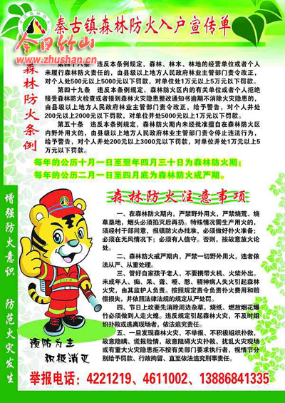 今日竹山网消息 在森林防火期到来之际,秦古镇认真贯彻落实“预防为主,积极消灭”的森林防火方针,从宣传入手,落实责任,并建立健全森林防火系列制度,确保森林资源安全。10月26日,该镇林业站印制了7000份《秦古森林防火知识宣传单》,由各村发到农村各家各户,做到村不漏组、组不漏户。宣传单上的内容有森林防火注意事项、防火办的电话以及森林防火条例有关规定等防火知识,以此提醒村民时刻注意用火安全。截止目前,该镇已发放宣传单6695份,成立森林防火协会16个,组建352名义务扑火队员。(程平)