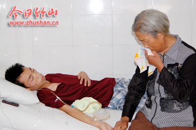 这个年轻人叫陈全举,今年29岁,柳林乡柳林河村人,之前一直在山西打工。父亲早年去世,家里再没有其他兄弟姐妹,只有年过70的老母亲留守。两个月以前陈全举突然发高烧,住院花费5000余元,一直没有得到确诊。一个月后回到竹山,在县医院接受治疗,被诊断为结核性心包炎、肠梗阻、肝硬化、肝腹水等一系列问题,其中结核性心包炎是危及生命最主要病症。毫无经济来源的母子俩无力承担医治费用,只好停止了治疗。不久病情加重,原本壮实的小伙子,体重消减到80多斤。无奈之下,年过七旬的老母亲东奔西走,借到几千元钱又将儿子带到妇幼保健院。眼下,已花光了所有的钱,家里唯一的希望倒在了病床上等待救治,生活一日三餐也无法保证……