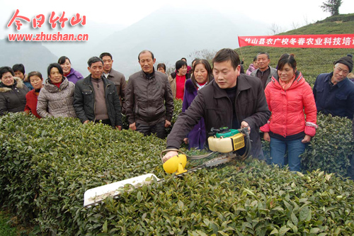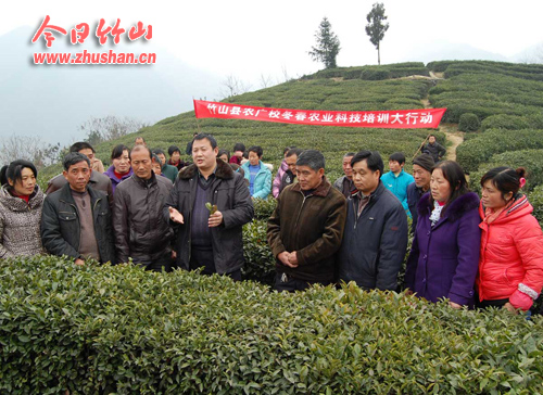 今日竹山网消息 2月29日,在城关镇刘家山村茶叶基地里,全村的100多名茶农围着县农业局总农艺师杨大明,他一边认真讲解茶叶春季管理知识,一边问答茶农提出的疑难问题。茶叶种植大户孟庆国高兴地说:“课堂上听农艺专家讲课,知道得不全面,理解得也不透彻,这次培训把课堂与实践相结合,掌握了很多知识,这样的培训,好!”