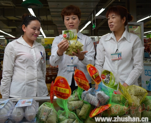 今日竹山网消息 5月26日,寿康永乐集团竹山综合超市副经理张再华(中)在对上柜前粽子进行质检。端午佳节来临之际,该超市在美化店堂环境、营造节日氛围、引导顾客消费、提升服务质量的同时,携手思念、久康、三全、三元、福润、雨润等食品厂家,开展粽子、汤圆等系列美食联合陈列、联合促销等优惠活动,以答谢新老顾客多年来对寿康永乐品牌的信赖、支持。(二月泉 史金贵)