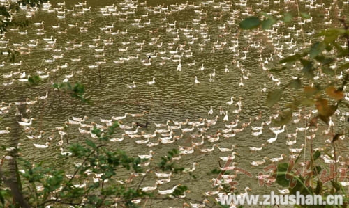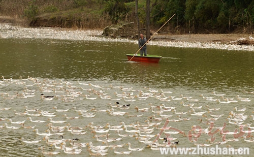 今日竹山网消息 11月12日,官渡镇木棕村大雁沟内,绿野旅游公司员工在池塘内“放牧”鸭群。绿野公司今秋落户官渡镇后,除开展旅游服务外,还与当地村民联合养鸭,目前共有8千多只。该公司计划依托养鸭,开展深加工,从而延伸产业链条。(袁斌 贺华)