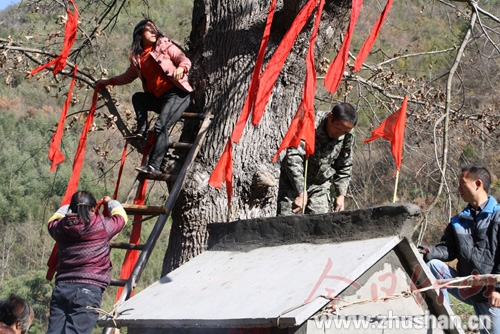 今日竹山网消息 12月3日,双台乡台子村八旬老汉陈咸龙、雄帮英、胡龙信等10户农民联合出资千元建起一座小庙保护古树。这棵古老的枫树已有千年树龄,主干4人还不能合抱,周长约8米,树高约30米,人们常在树底下休闲聊天。据陈老汉介绍,从他记事时起就有这么粗,先辈们用五寸长的大铁钉钉满树身,防止外人侵犯它,所以它才能活到千年。今年不知从何时起,这棵枫树接连遭受病虫害和人为的破坏。为保护这棵古树,村里10多户农民自愿出资建起古树庙,并明确了负责人,建立了保护制度,实行一户一月轮流看守。(陈昌荣)