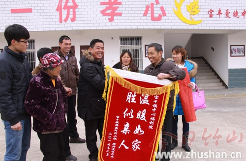 今日竹山网消息 2月6日,宝丰镇中心福利院爱晚中心77岁的托养老人周兴连(左二)的子女将一面绣有“温暖如家 胜似亲人”的锦旗和一封充满感激之情的感谢信送到了福利院院长张西平(右二)手中,真诚感谢福利院工作人员对其母亲的细心照料。