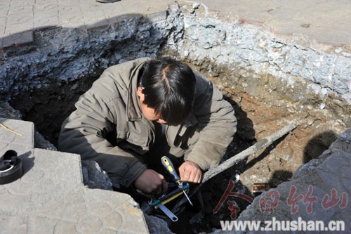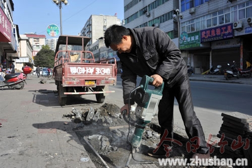 今日竹山网消息 12月12日,记者在人民路城西段看到,园林工人正在道路两边的人行道上开凿路面砌筑树槽。