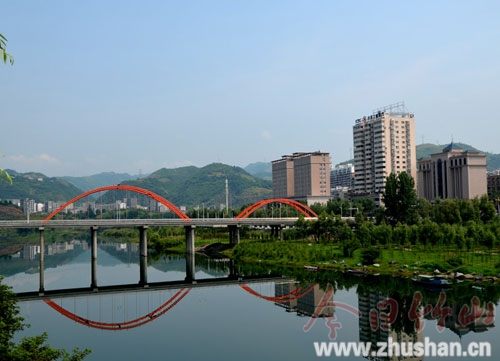 河边绿树成荫,湖水蔚蓝如镜,三桥映在水中的影子如彩虹般美丽,构成了一幅瑰丽的动感图画。 (苗东升 摄)