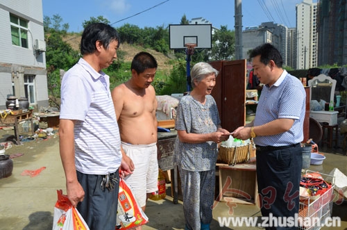 7月16日晚的特大暴雨,导致城关镇莲花村8组村民温玉梅房屋内遭遇泥水灾害,家电及衣被损毁,至今屋内淤泥尚未清除,暂住在村委会里。7月21日上午,竹山籍铁道兵战友联谊会闻讯后,动用联谊会费,会长刘孝明(右)、副会长兰世清(左)为莲花村8组重灾户、年逾七旬的老人温玉梅送来大米、油和500元慰问金,帮助她家度过难关,温玉梅十分感激。(二月泉)