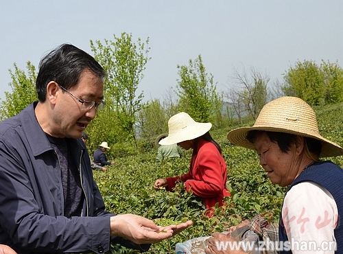 公司经理陈敦桥(左)与茶农交流采摘鲜叶